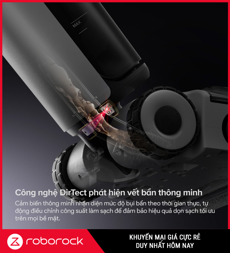Một trong những điểm nổi bật trên Roborock F25 Gen 2 là công nghệ DirTect – công nghệ thông minh giúp máy nhận diện mức độ bẩn trên sàn và tự động điều chỉnh chế độ làm sạch phù hợp.