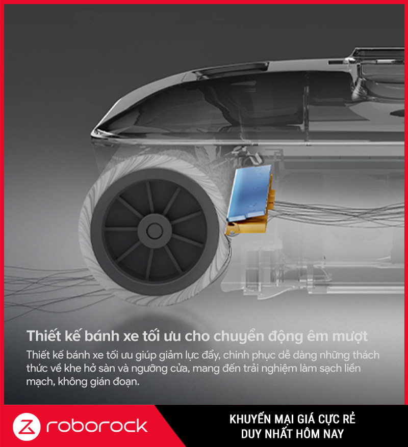 Bánh xe trên Roborock F25 Gen 2 được thiết kế để hỗ trợ di chuyển mượt mà và ổn định trong suốt quá trình lau hút. Khi sử dụng thực tế, máy cho cảm giác đẩy kéo khá nhẹ, linh hoạt hơn khi cần đổi hướng hoặc di chuyển giữa các khu vực trong nhà.
