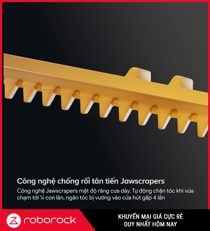 Với những gia đình có người tóc dài hoặc nuôi thú cưng, tình trạng tóc quấn vào con lăn luôn là vấn đề khó chịu. Roborock F25 Gen 2 giải quyết điều này bằng công nghệ Jawscrapers Anti-Tangle.