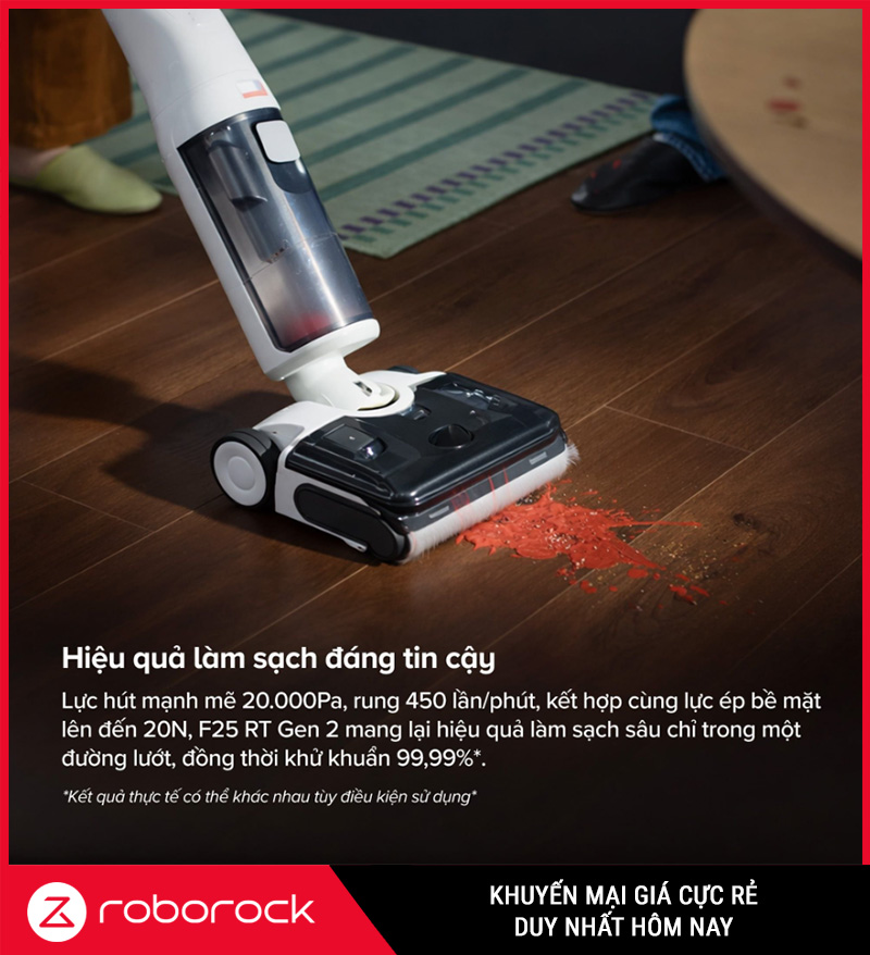 Roborock F25 RT Gen 2 được trang bị lực hút 20.000Pa, giúp xử lý tốt: