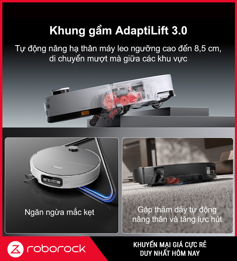 Ví dụ thực tế: Có gờ nhà tắm hoặc nẹp cửa cao → robot thường kẹt khi chuyển phòng. AdaptiLift giúp vượt qua ổn định hơn để dọn trọn tuyến.