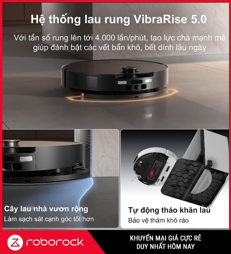 Khác với kiểu lau kéo thông thường (chủ yếu “lau qua”), VibraRise 5.0 sử dụng cơ chế rung/chà liên tục để tăng hiệu quả: