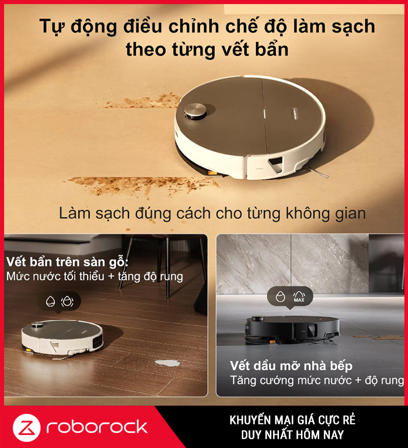 Tự điều chỉnh hút/lau theo nhu cầu và bề mặt (tuỳ thiết lập trong app).