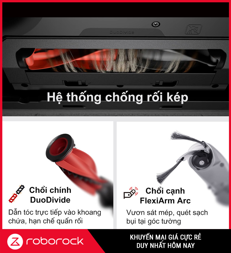 Chống rối kép Dual Anti-Tangle hạn chế quấn lông/tóc vào chổi → robot chạy bền, ít phải gỡ thủ công.