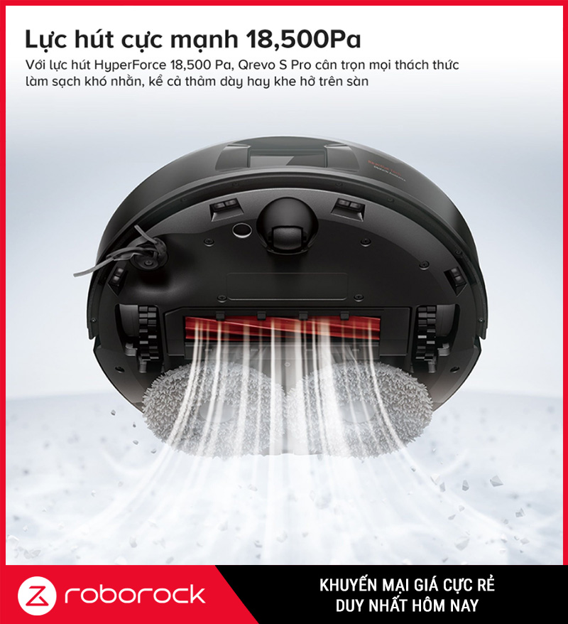 Roborock Qrevo S Pro được trang bị lực hút HyperForce 18.500Pa – mức lực hút rất cao, giúp robot xử lý tốt các tình huống “khó chịu” trong nhà như: